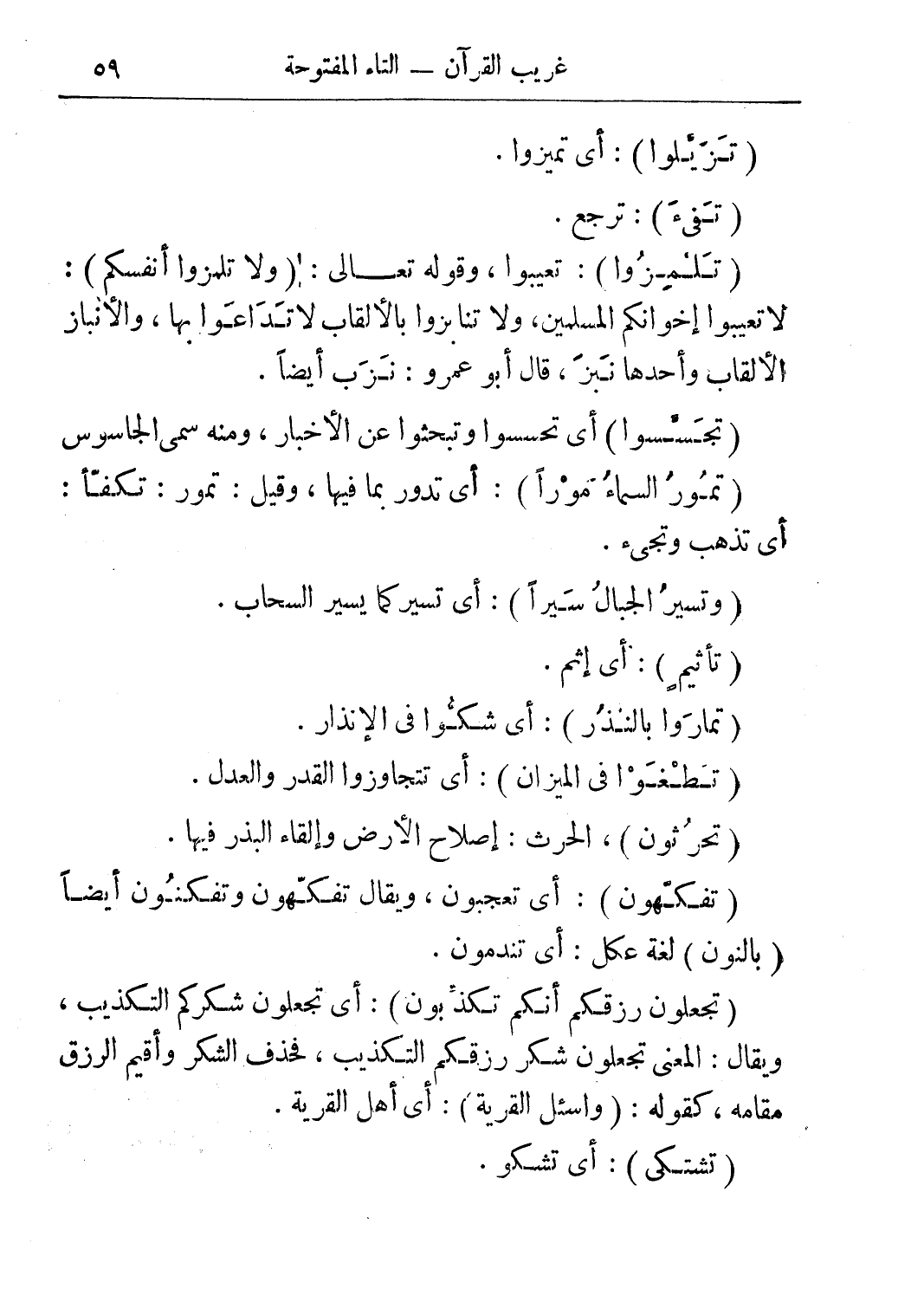 مُرْتَفع من الأَرْض أعراف وَاحِدهَا عرف. وَمِنْه عرف الديك سمي عرفا لارتفاعه. وَيسْتَعْمل فِي الشّرف وَالْمجد وَأَصله فِي الْبناء. أقلت سحابا ثقالا: يَعْنِي الرّيح حملت سحابا ثقالا بِالْمَاءِ. يُقَال: أقل فلَان الشَّيْء واستقل بِهِ إِذا أطاقه وَحمله. وَفُلَان لَا يسْتَقلّ بِحمْلِهِ [أَي لَا يُطيق] وَإِنَّمَا سميت الكيزان قلالا لِأَنَّهَا تقل بِالْأَيْدِي أَي تحمل فيشرب مِنْهَا. آلَاء الله: نعمه وَاحِدهَا إِلَى وألى وإلي. فَكيف آسى: أَحْزَن. أرجئه: أَخّرهُ، أَي احبسه وَأخر أمره. [آسفونا: أغضبونا. وَالْمعْنَى: آسفوا أولياءنا. كَقَوْلِه: {يُؤْذونَ الله وَرَسُوله} أَي يُؤْذونَ أَوْلِيَاء الله وَرُسُله] . آسفا: شَدِيد الْغَضَب [وَمِنْه قَوْله تَعَالَى: {غَضْبَان