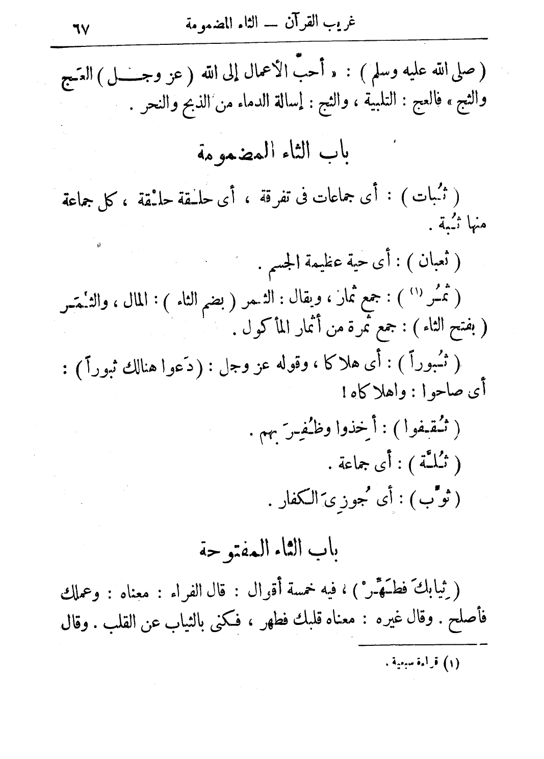 أرذل الْعُمر: الْهَرم الَّذِي ينقص قوته وعقله [ويصيره] إِلَى الخرف وَنَحْوه. أثاث: مَتَاع الْبَيْت. وَاحِدهَا أثاثه. أكنان: جمع كن، وَهُوَ مَا ستر [وَوقى] من الْحر وَالْبرد. أنكاث: جمع نكث وَهُوَ مَا نقض من غزل الشّعْر وَغَيره. أَن تكون أمة هِيَ أربى من أمة: أَي أَزِيد عددا. وَمن هَذَا سمي الرِّبَا [لِأَنَّهُ زِيَادَة على المَال] . أمرنَا وآمرنا: بِمَعْنى وَاحِد. أَي كَثرْنَا. وأمرنا: جعلناهم أُمَرَاء.