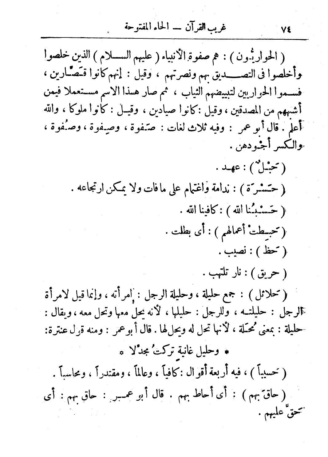 مَوَاطِن، مِنْهَا الْأَذَان والتلبية [وَغير ذَلِك] . أدعياءكم: من تبنيتموهم. أقطارها وأقتارها وَاحِد [أَي] جوانبها [و] الْوَاحِد قطر وقتر. أشحة: جمع شحيح أَي بخيل. أوبي مَعَه: سبحي مَعَه. والتأويب سير النَّهَار [كُله] . فَكَأَن الْمَعْنى سبحي مَعَه نهارك كُله كتأويب السائر نَهَاره كُله. وَقيل: أوبي مَعَه: سبحي بِلِسَان الْحَبَشَة. أسلنا: أذبنا، من قَوْلك: سَالَ الشَّيْء وأسلته أَنا. أثل: شجر يشبه بالطرفاء؛ إِلَّا أَنه أعظم مِنْهُ. أَسرُّوا الندامة: أظهروها، وَيُقَال كتموها، وَيُقَال: كتمها العظماء من السفلة الَّذين أضلوهم , وَأسر من الأضداد.