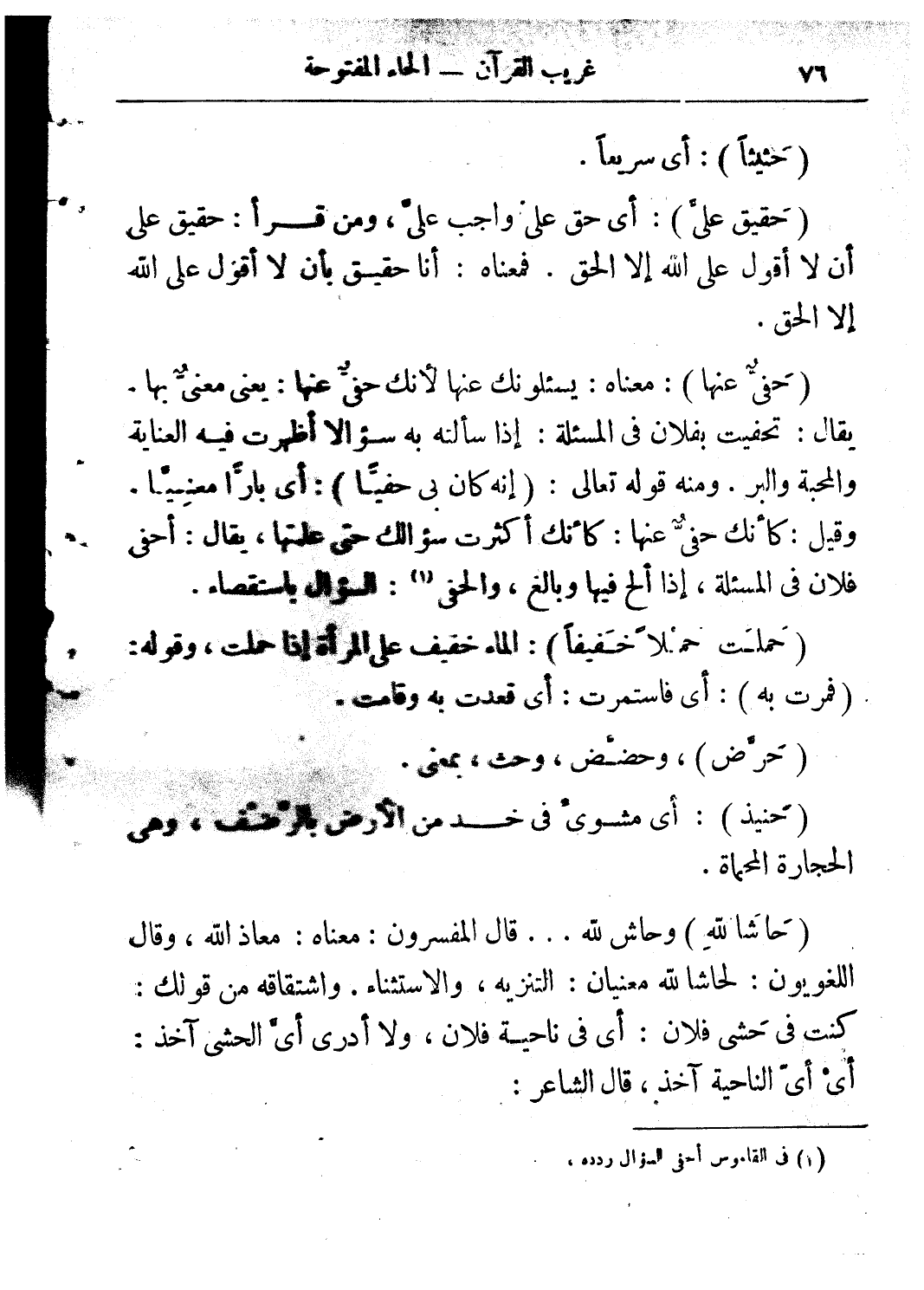 نَفسه حياطتها، وَالْقِيَام بهَا. أَحْبَبْت حب الْخَيْر عَن ذكر رَبِّي: أَي آثرت حب الْخَيل على ذكر رَبِّي. وَسميت الْخَيل الْخَيْر لما فِيهَا من الْمَنَافِع. وَجَاء فِي الحَدِيث: ((الْخَيْر مَعْقُود بنواصي الْخَيل)) . الأيد: الْقُوَّة، كَقَوْلِه تَعَالَى: {دَاوُد ذَا الأيد} . وَأما قَوْله تَعَالَى: {أولي الْأَيْدِي والأبصار} فالأيدي من الْإِحْسَان. يُقَال: لَهُ يَد فِي الْخَيْر، وَقدم فِي الْخَيْر. والأبصار: البصائر فِي الدَّين. أتراب: أَقْرَان، أَي أَسْنَان. وَاحِدهَا ترب. أشرقت الأَرْض: أَضَاءَت. أمتنَا اثْنَتَيْنِ وأحييتنا اثْنَتَيْنِ: مثل / قَوْله / {وكنتم أَمْوَاتًا فأحياكم ثمَّ يميتكم ثمَّ يُحْيِيكُمْ} فالموتة الأولى كَونهم نطفا فِي أصلاب