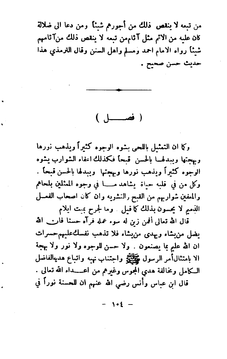 قال الله تعالى أفمن زين له سوء عمله فرآه حسناً فإن الله يضل من يشاء ويهدي من يشاء فلا تذهب نفسك عليهم حسرات إن الله عليم بما يصنعون. ولا حسن للوجوه ولا نور ولا بهجة إلا بامتثال أمر الرسول صلى الله عليه وسلم واجتناب نهيه واتباع هديه الفاضل الكامل ومخالفة هدي المجوس وغيرهم من أعداء الله تعالى.