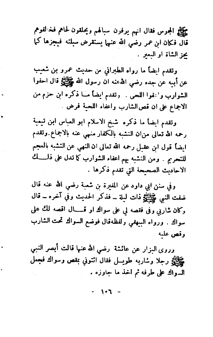 صلى الله عليه وسلم المجوس فقال إنهم يوفون سبالهم ويحلقون لحاهم فخالفوهم قال فكان ابن عمر رضي الله عهما يستقرض سبلته فيجزها كما يجز الشاة أو البعير.