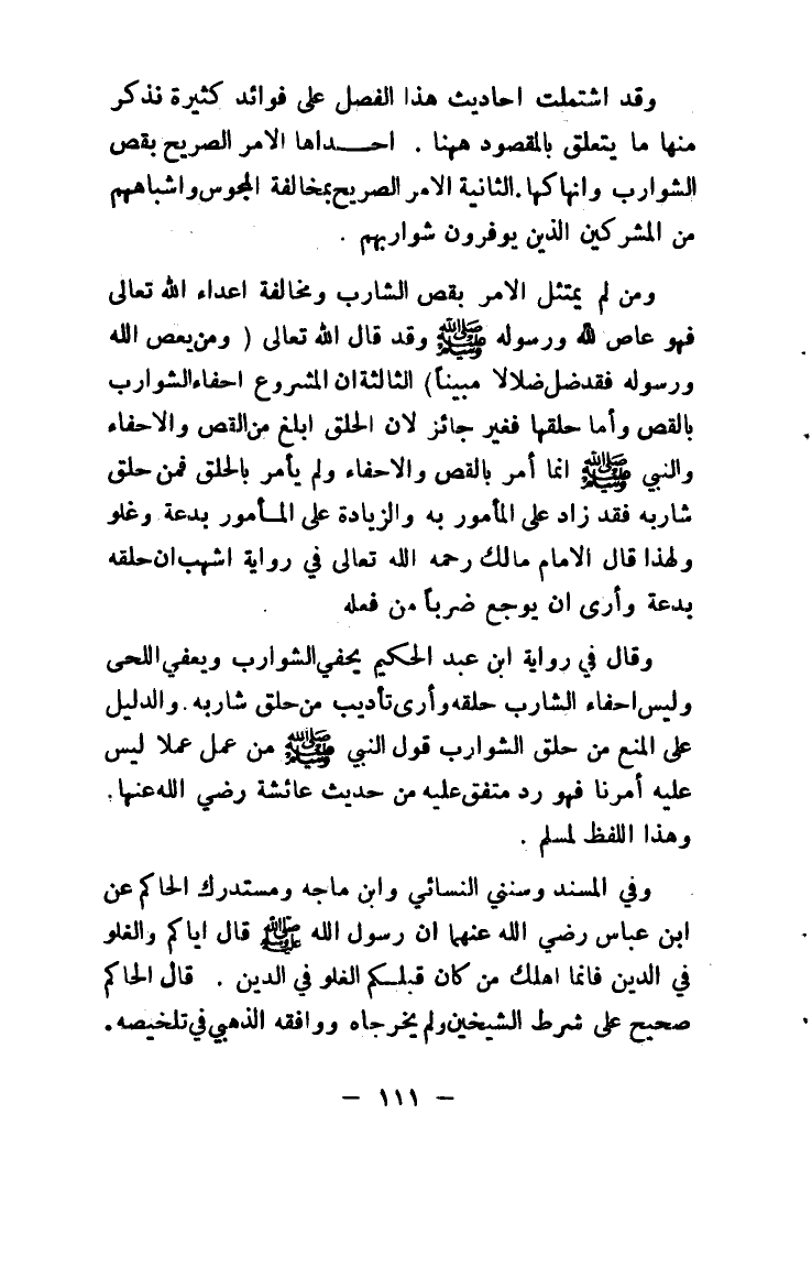 وقد اشتملت أحاديث هذا الفصل على فوائد كثيرة نذكر منها ما يتعلق بالمقصود ههنا. أحدها الأمر الصريح بقص الشوارب وإنهاكها. الثانية الأمر الصريح بمخالفة المجوس وأشباههم من المشركين الذين يوفرون شواربهم.