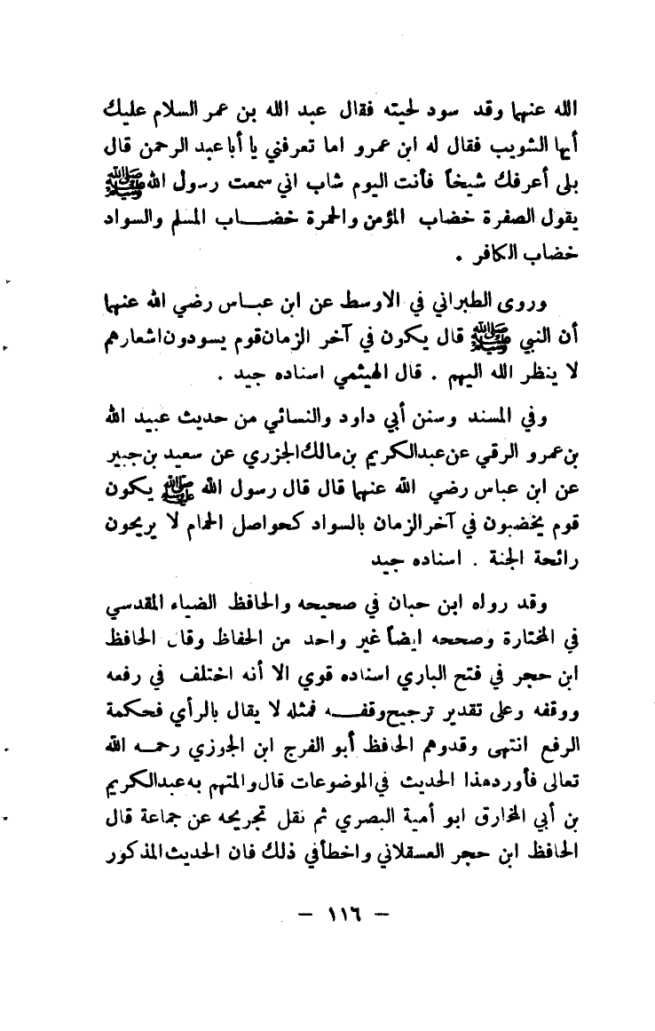 وفي المسند وسنن أبي داود والنسائي من حديث عبيدالله بن عمرو الرقي عن عبد الكريم بن مالك الجزري عن سعيد بن جبير عن ابن عباس رضي الله عنهما قال قال رسول الله صلى الله عليه وسلم يكون قوم يخضبون في آخر الزمان بالسواد كحواصل الحمام لا يريحون رائحة الجنة. إسناده جيد. وقال الحافظ صلاح الدين العلائي في كتابه (النقد الصحيح) إسناده على شرط الصحيحين.