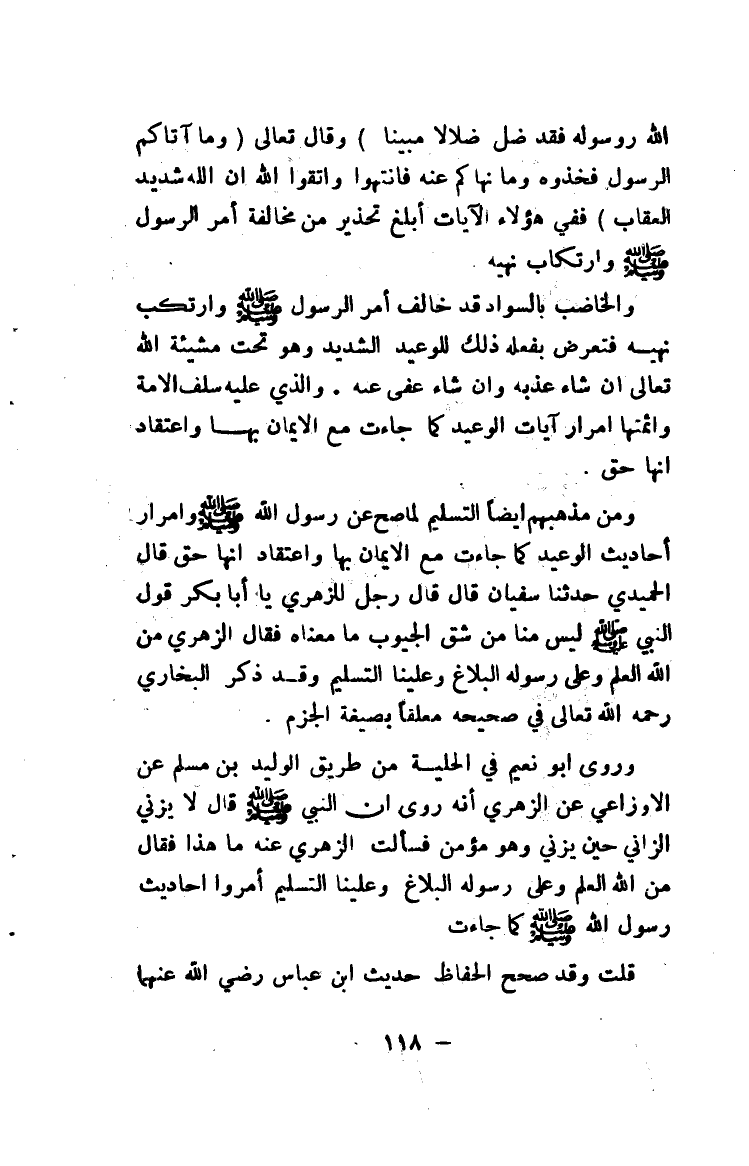 ومن مذهبهم أيضاً التسليم لما صح عن رسول الله صلى الله عليه وسلم وإمرار أحاديث الوعيد كما جاءت مع الإيمان بها واعتقاد أنها حق قال الحميدي حدثنا سفيان قال قال رجل للزهري يا أبا بكر قول النبي صلى الله عليه وسلم ليس منا من شق الجيوب ما معناه فقال الزهري من الله العلم وعلى رسوله البلاغ وعلينا التسليم وقد ذكر البخاري رحمه الله تعالى في صحيحه معلقاً بصيغة الجزم.