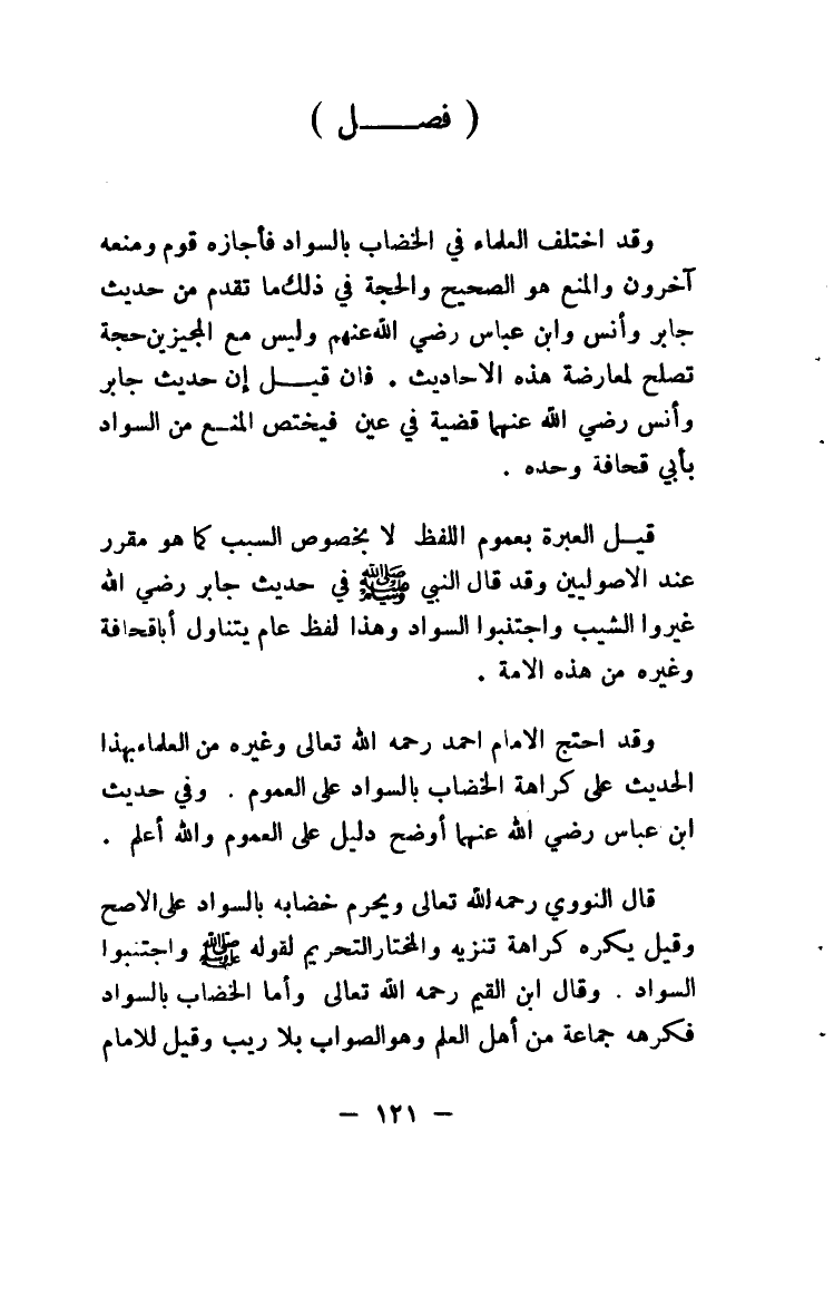 وقد اختلف العلماء في الخضاب بالسواد فأجازه قوم ومنعه آخرون والمنع هو الصحيح والحجة في ذلك ما تقدم من حديث جابر وأنس وابن عباس رضي الله عنهم وليس مع المجيزين حجة تصلح لمعارضة هذه الأحاديث. فإن قيل إن حديث جابر وأنس رضي الله عنهما قضية في عين فيختص المنع من السواد بأبي قحافة وحده.