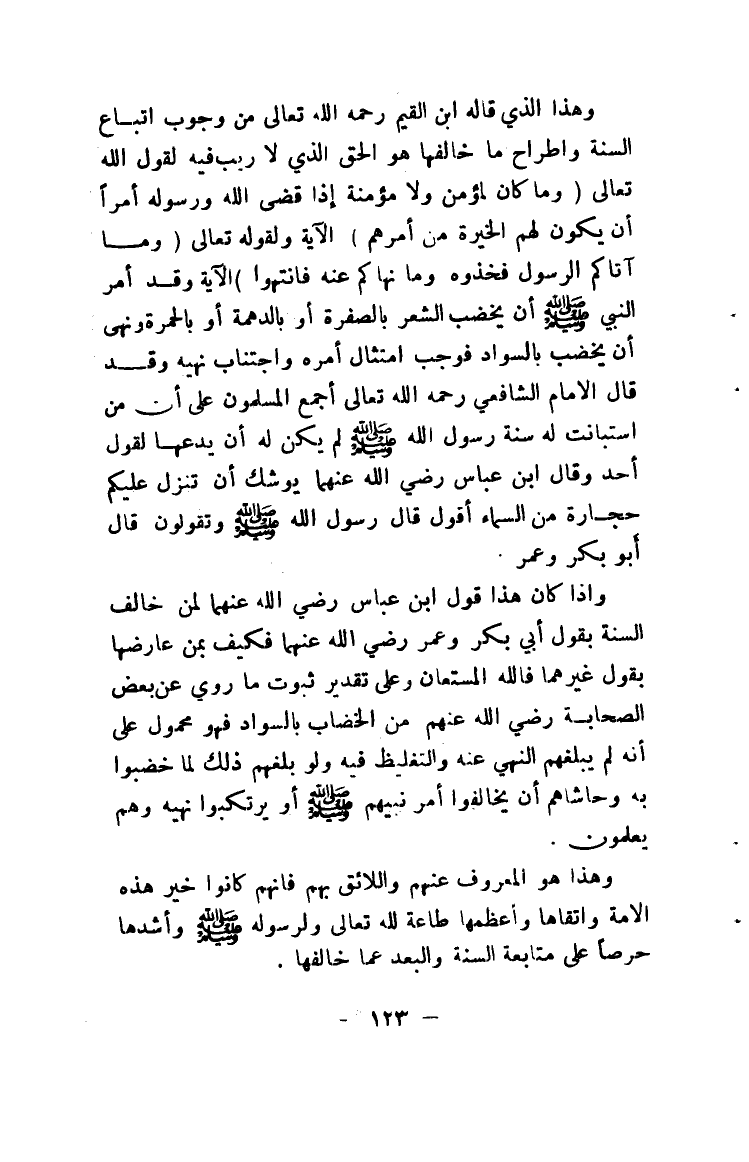 وهذا الذي قاله ابن القيم رحمه الله تعالى من وجوب اتباع السنة واطراح ما خالفها هو الحق الذي لا ريب فيه لقول الله تعالى {وَمَا كَانَ لِمُؤْمِنٍ وَلا مُؤْمِنَةٍ إِذَا قَضَى اللَّهُ وَرَسُولُهُ أَمْراً أَنْ يَكُونَ لَهُمُ الْخِيَرَةُ مِنْ أَمْرِهِمْ} [الأحزاب: 36]، الآية ولقوله تعالى {وَمَا آتَاكُمُ الرَّسُولُ فَخُذُوهُ وَمَا نَهَاكُمْ عَنْهُ فَانْتَهُوا} [الحشر: 7]، الآية وقد أمر النبي صلى الله عليه وسلم أن يخضب الشعر بالصفرة أو بالدهمة أو بالحمرة ونهى أن يخضب بالسواد فوجب امتثال أمره واجتناب نهيه وقد قال الإمام الشافعي رحمه الله تعالى أجمع المسلمون على أن من استبانت له سنة رسول الله صلى الله عليه وسلم لم يكن له أن يدعها لقول أحد وقال ابن عباس رضي الله عنهما يوشك أن تنزل عليكم حجارة من السماء أقول قال رسول الله صلى الله عليه وسلم وتقولون قال أبو بكر وعمر.