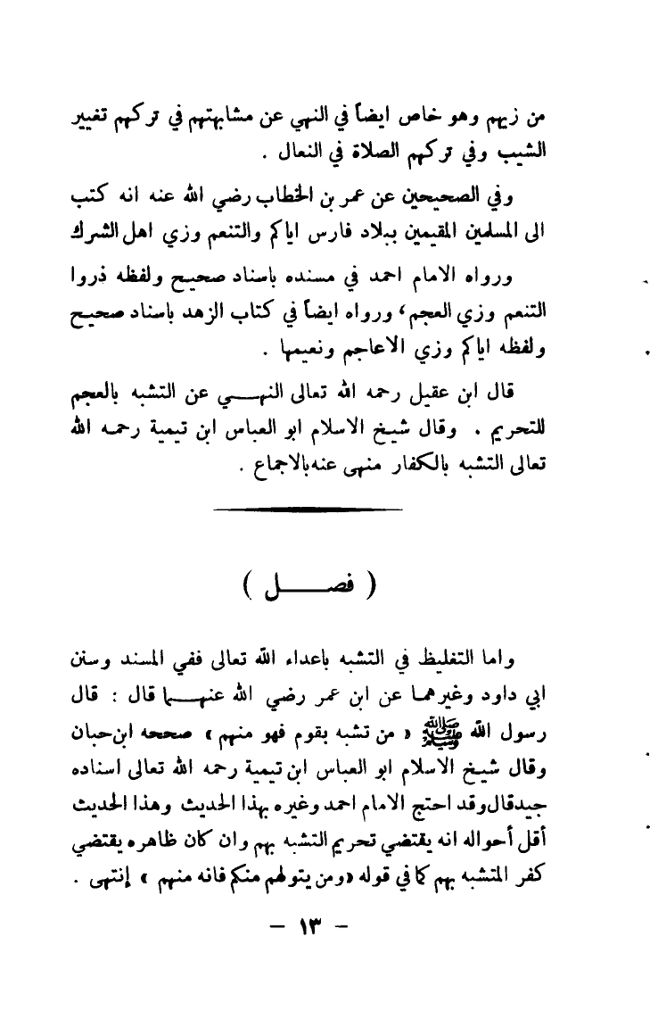 قال ابن عقيل رحمه الله تعالى النهي عن التشبه بالعجم للتحريم. وقال شيخ الإسلام أبو العباس ابن تيمية رحمه الله تعالى التشبه بالكفار منهي عنه بالإجماع.