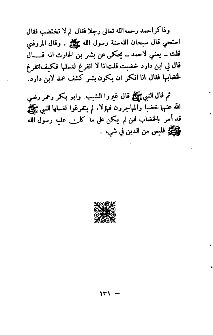 وذاكر أحمد رحمه الله تعالى رجلاً فقال لم لا تختضب فقال أستحي قال سبحان الله سنة رسول الله صلى الله عليه وسلم. وقال المروذي قلت - يعني لأحمد - يحكى عن بشر بن الحارث أنه قال قال لي ابن داود خضبت قلت أنا لا أتفرغ لغسلها فكيف أتفرغ لخضابها فقال أنا أنكر أن يكون بشر كشف عمله لابن داود.