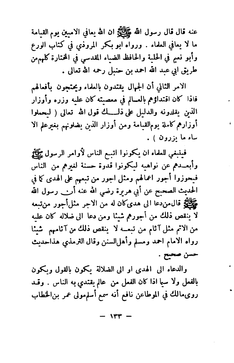فينبغي للعلماء أن يكونوا أتبع الناس لأوامر الرسول صلى الله عليه وسلم وأبعدهم عن نواهيه ليكونوا قدوة حسنة لغيرهم من الناس فيحوزوا أجور أعمالهم ومثل أجور من تبعهم على الهدى كما في الحديث الصحيح عن أبي هريرة رضي الله عنه أن رسول الله صلى الله عليه وسلم قال من دعا إلى هدى كان له من الأجر مثل أجور من تبعه لا ينقص ذلك من أجورهم شيئاً ومن دعا إلى ضلالة كان عليه من الإثم مثل آثام من تبعه لا ينقص ذلك من آثامهم شيئاً رواه الإمام أحمد ومسلم وأهل السنن وقال الترمذي هذا حديث حسن صحيح.