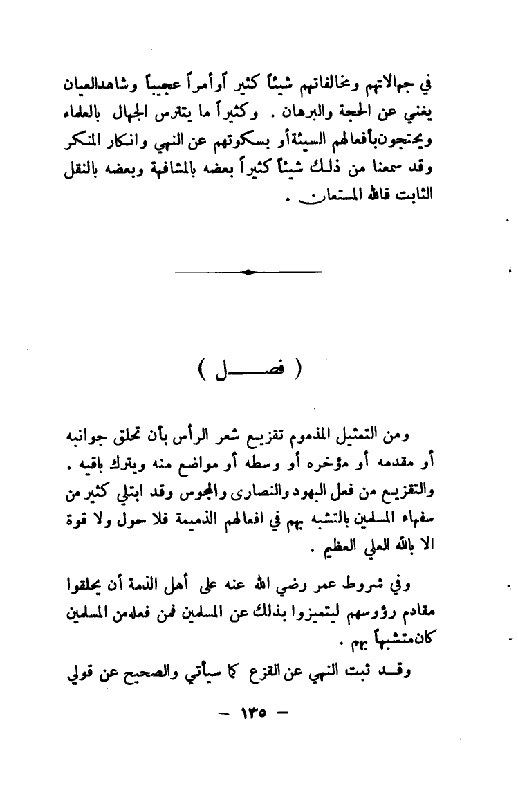 وفي شروط عمر رضي الله عنه على أهل الذمة أن يحلقوا مقادم رؤوسهم ليتميزوا بذلك عن المسلمين فمن فعله من المسلمين كان متشبهاً بهم.