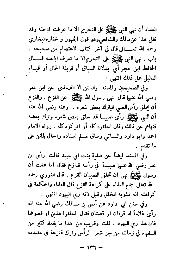 وفي الصحيحين والمسند والسنن إلا الترمذي عن ابن عمر رضي الله عنهما قال نهى رسول الله صلى الله عليه وسلم عن القزع. والقزع أن يحلق رأس الصبي فيترك بعض شعره. وعنه رضي الله عنه أن النبي صلى الله عليه وسلم رأى صبياً قد حلق بعض شعره وترك بعضه فنهاهم عن ذلك وقال احلقوه كله أو اتركوه كله. رواه الإمام أحمد وأبو داود والنسائي وساق مسلم إسناده وأحال بالمتن على ما تقدم.