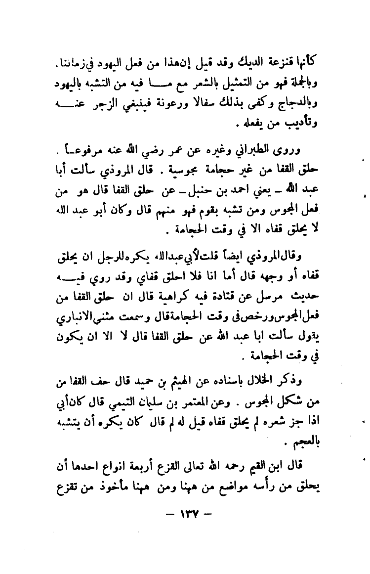 وروى الطبراني وغيره عن عمر رضي الله عنه مرفوعاً. حلق القفا من غير حجامة مجوسية. قال المروذي سألت أبا عبد الله - يعني أحمد بن حنبل - عن حلق القفا قال هو من فعل المجوس ومن تشبه بقوم فهو منهم قال وكان أبو عبد الله لا يحلق قفاه إلا في وقت الحجامة.