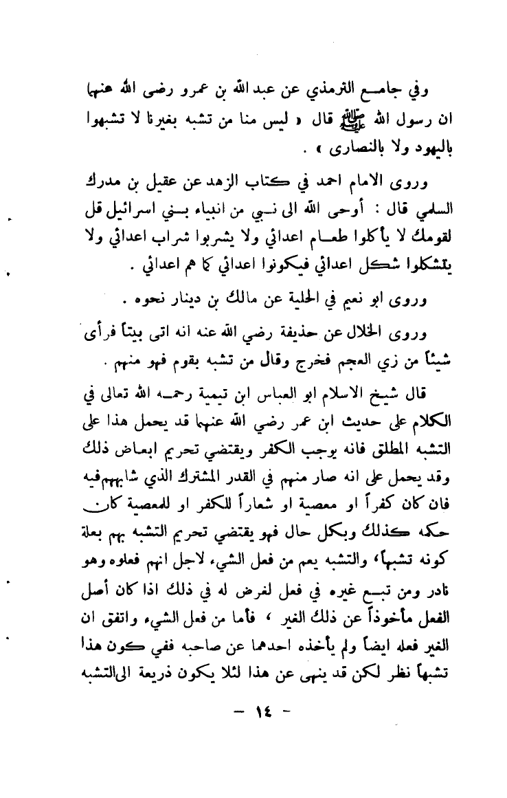 قال شيخ الإسلام أبو العباس ابن تيمية رحمه الله تعالى في الكلام على حديث ابن عمر رضي الله عنهما قد يحمل هذا على التشبه المطلق فإنه يوجب الكفر ويقتضي تحريم أبعاض ذلك وقد يحمل على أنه صار منهم في القدر المشترك الذي شابههم فيه فإن كان كفراً أو معصية أو شعاراً للكفر أو للمعصية كان حكمه كذلك وبكل حال فهو يقتضي تحريم التشبه بهم بعلة كونه تشبهاً، والتشبه يعم من فعل الشيء لأجل أنهم فعلوه وهو نادر ومن تبع غيره في فعل لغرض له في ذلك إذا كان أصل الفعل مأخوذاً عن ذلك الغير، فأما من فعل الشيء واتفق أن الغير فعله أيضاً ولم يأخذه أحدهما عن صاحبه ففي كون هذا تشبهاً نظر لكن قد ينهى عن هذا لئلا يكون ذريعة إلى التشبه