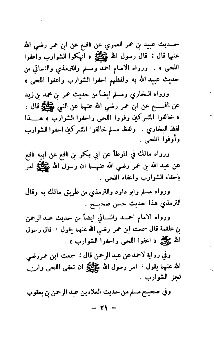 حديث عبيد بن عمر العمري عن نافع عن ابن عمر رضي الله عنهما قال: قال رسول الله صلى الله عليه وسلم «انهكوا الشوارب واعفوا اللحى». ورواه الإمام أحمد ومسلم والترمذي والنسائي من حديث عبيد الله به ولفظهم احفوا الشوارب واعفوا اللحى.