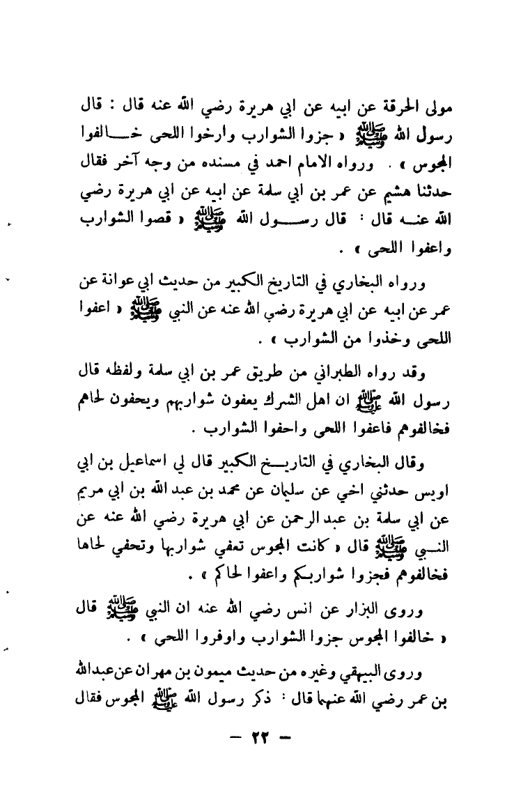 مولى الحرقة عن أبيه عن أبي هريرة رضي الله عنه قال: قال رسول الله صلى الله عليه وسلم «جزوا الشوارب وأرخوا اللحى خالفوا المجوس». ورواه الإمام أحمد في مسنده من وجه آخر فقال حدثنا هشيم عن عمر بن أبي سلمة عن أبيه عن أبي هريرة رضي الله عنه قال: قال رسول الله صلى الله عليه وسلم «قصوا الشوارب واعفوا اللحى».