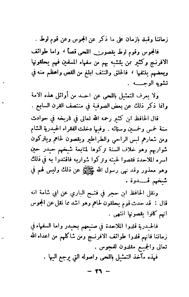 ولا يعرف التمثيل باللحى عن أحد من أوائل هذه الأمة وإنما ذكر ذلك عن بعض الصوفية في منتصف القرن السابع.