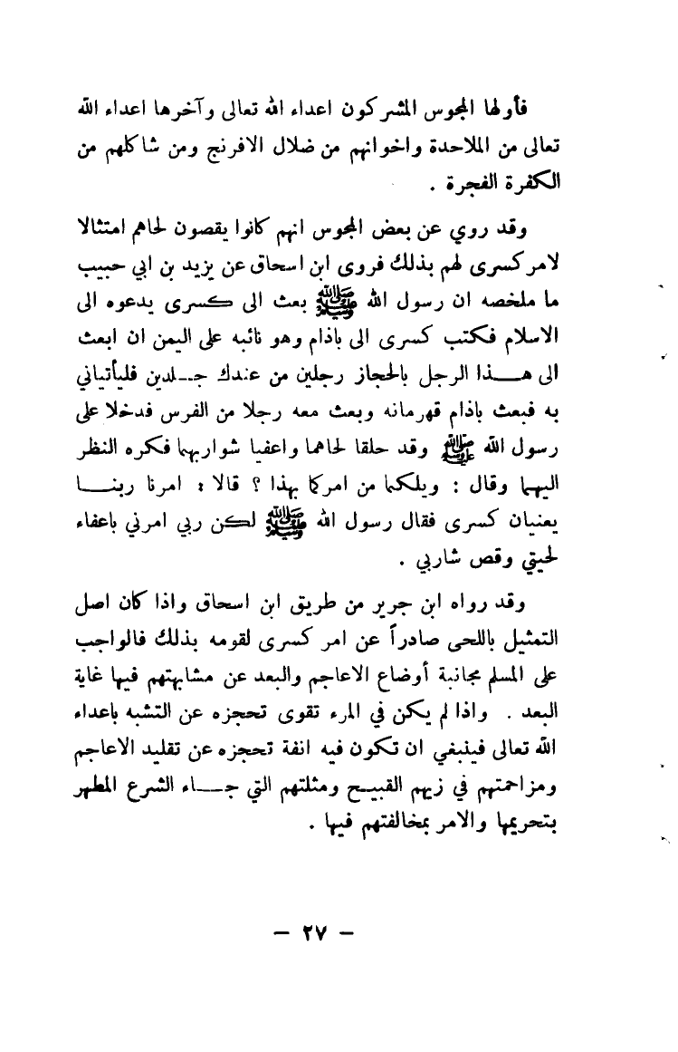 وقد رواه ابن جرير من طريق ابن إسحاق وإذا كان أصل التمثيل باللحى صادراً عن أمر كسرى لقومه بذلك فالواجب على المسلم مجانبة أوضاع الأعاجم والبعد عن مشابهتهم فيها غاية البعد. وإذا لم يكن في المرء تقوى تحجزه عن التشبه بأعداء الله تعالى فينبغي أن تكون فيه أنفة تحجزه عن تقليد الأعاجم ومزاحمتهم في زيهم القبيح ومثلتهم التي جاء الشرع المطهر بتحريمها والأمر بمخالفتهم فيها.