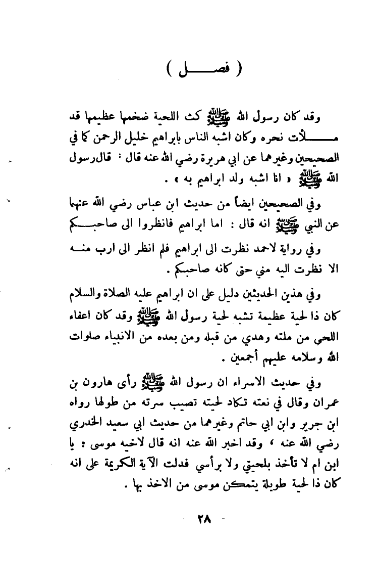 وقد كان رسول الله صلى الله عليه وسلم كث اللحية ضخمها عظيمها قد ملأت نحره وكان أشبه الناس بإبراهيم خليل الرحمن كما في الصحيحين وغيرهما عن أبي هريرة رضي الله عنه قال: قال رسول الله صلى الله عليه وسلم «أنا أشبه ولد إبراهيم به».