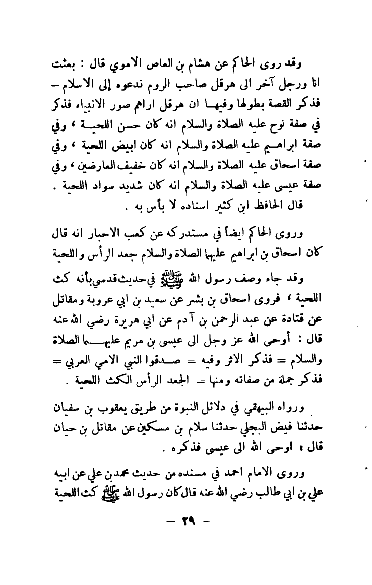 وقد روى الحاكم عن هشام بن العاص الأموي قال: بعثت أنا ورجل آخر إلى هرقل صاحب الروم ندعوه إلى الإسلام - فذكر القصة بطولها وفيها أن هرقل أراهم صور الأنبياء فذكر في صفة نوح عليه الصلاة والسلام أنه كان حسن اللحية، وفي صفة إبراهيم عليه الصلاة والسلام أنه كان أبيض اللحية وفي صفة إسحاق عليه الصلاة والسلام أنه كان خفيف العارضين وفي صفة عيسى عليه الصلاة والسلام أنه كان شديد سواد اللحية.