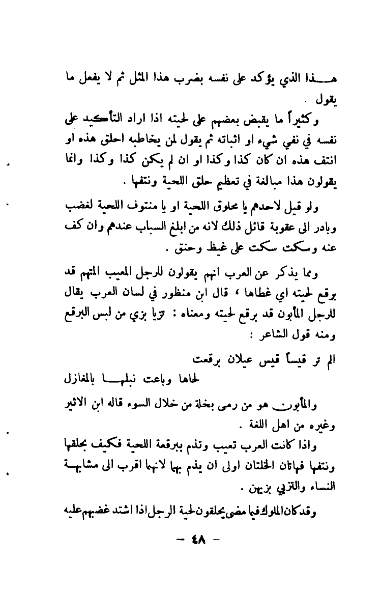 وإذا كانت العرب تعيب وتذم ببرقعة اللحية فكيف بحلقها ونتفها فهاتان الخلتان أولى أن يذم بهما لأنهما أقرب إلى مشابهة النساء والتزيي بزيهن.