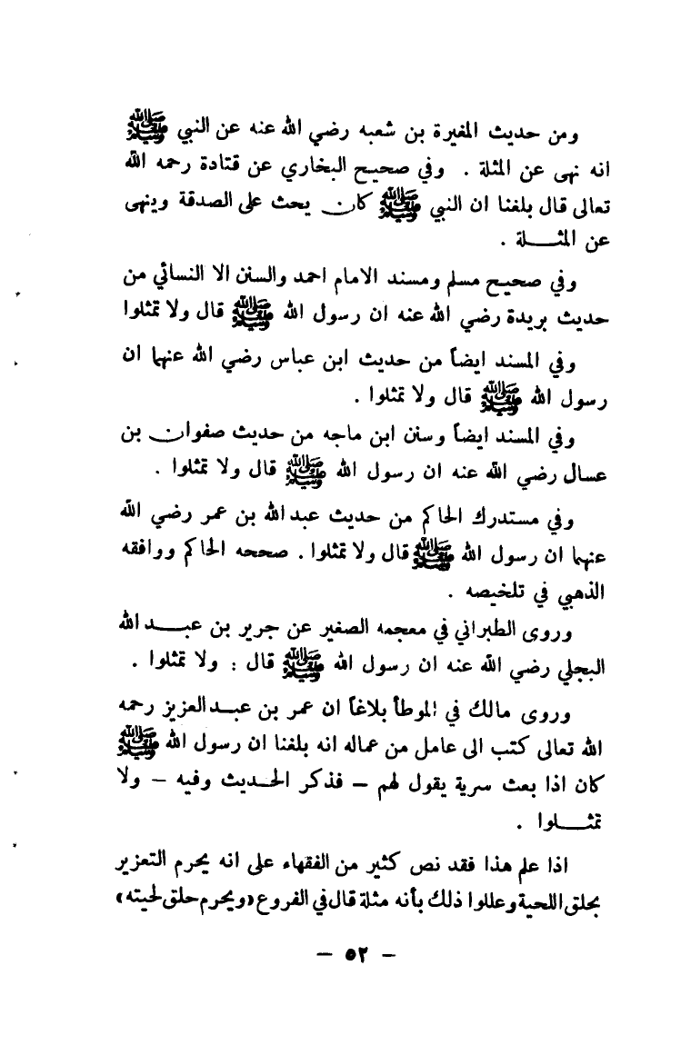 وروى الطبراني في معجمه الصغير عن جرير بن عبد الله البجلي رضي الله عنه أن رسول الله صلى الله عليه وسلم قال: ولا تمثلوا.