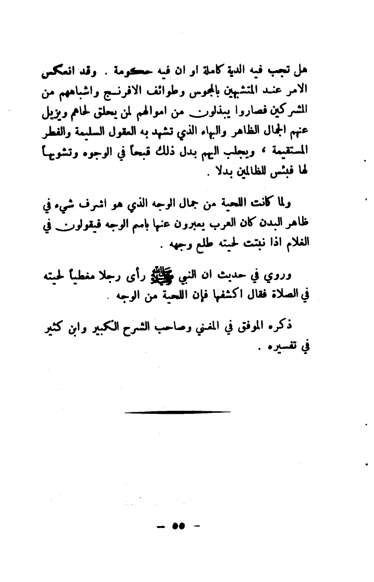 هل تجب فيه الدية كاملة أو أن فيه حكومة. وقد انعكس الأمر عند المتشبهين بالمجوس وطوائف الإفرنج وأشباههم من المشركين فصاروا يبذلون من أموالهم لمن يحلق لحاهم ويزيل عنهم الجمال الظاهر والبهاء الذي تشهد به العقول السليمة والفطر المستقيمة، ويجلب إليهم بدل ذلك قبحاً في الوجوه وتشويهاً لها فبئس للظالمين بدلا.
