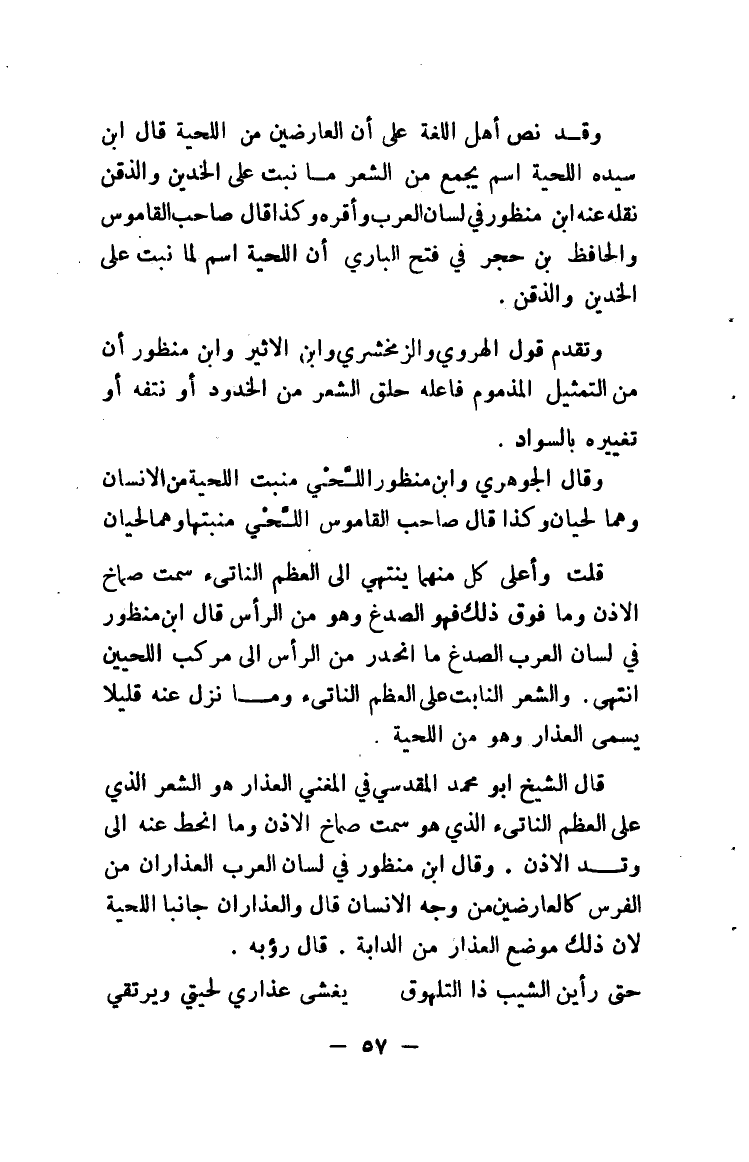 وقد نص أهل اللغة على أن العارضين من اللحية قال ابن سيده اللحية اسم يجمع من الشعر ما نبت على الخدين والذقن نقله عنه ابن منظور في لسان العرب وأقره وكذا قال صاحب القاموس والحافظ بن حجر في فتح الباري أن اللحية اسم لما نبت على الخدين والذقن.