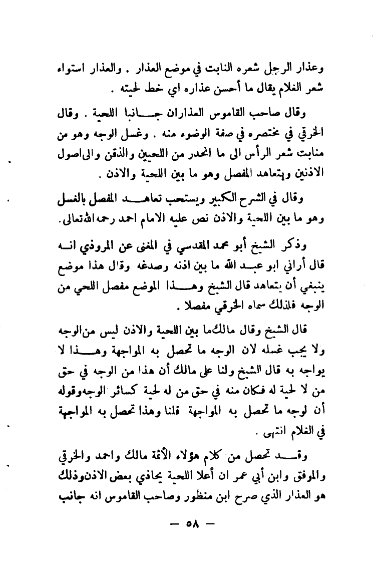 وقد تحصل من كلام هؤلاء الأئمة مالك وأحمد والخرقي والموفق وابن أبي عمر أن أعلا اللحية يحاذي بعض الأذن وذلك هو العذار الذي صرح ابن منظور وصاحب القاموس أنه جانب