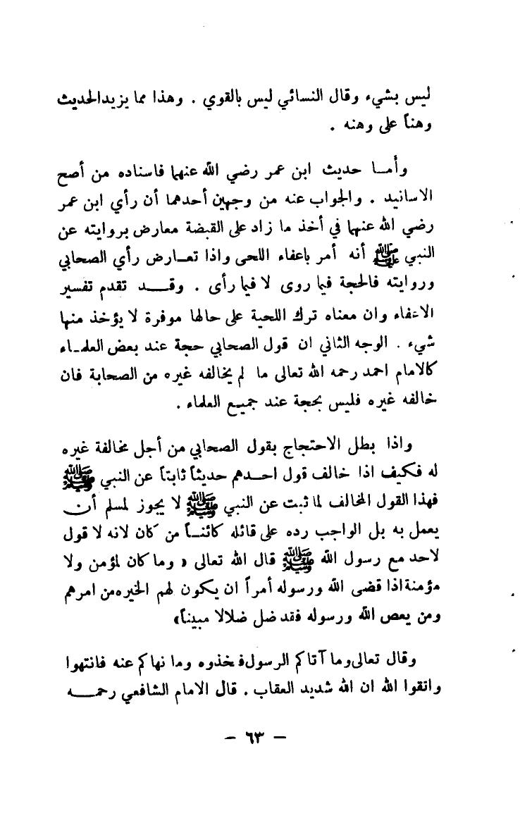 وأما حديث ابن عمر رضي الله عنهما فإسناده من أصح الأسانيد. والجواب عنه من وجهين أحدهما أن رأي ابن عمر رضي الله عنهما في أخذ ما زاد على القبضة معارض بروايته عن النبي صلى الله عليه وسلم أنه أمر بإعفاء اللحى وإذا تعارض رأي الصحابي وروايته فالحجة فيما روى لا فيما رأى. وقد تقدم تفسير الإعفاء وأن معناه ترك اللحية على حالها موفرة لا يؤخذ منها شيء. الوجه الثاني أن قول الصحابي حجة عند بعض العلماء كالإمام أحمد رحمه الله تعالى ما لم يخالفه غيره من الصحابة فإن خالفه غيره فليس بحجة عند جميع العلماء.