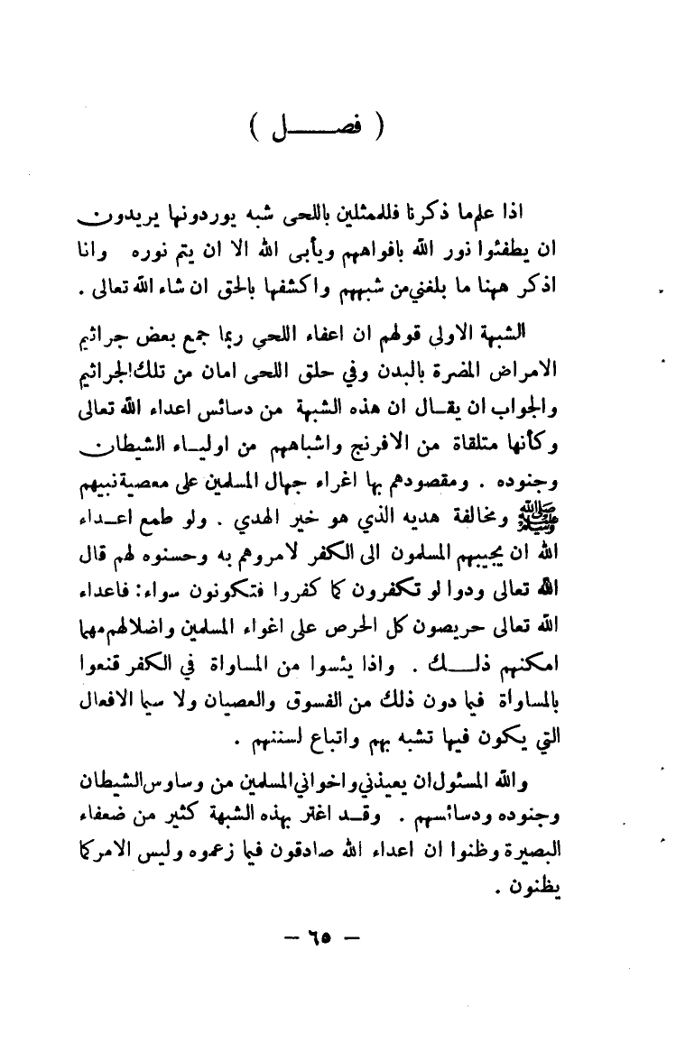 الشبهة الأولى قولهم أن إعفاء اللحى ربما جمع بعض جراثيم الأمراض المضرة بالبدن وفي حلق اللحى أمان من تلك الجراثيم والجواب أن يقال إن هذه الشبهة من دسائس أعداء الله تعالى وكأنها متلقاة من الإفرنج وأشباههم من أولياء الشيطان وجنوده. ومقصودهم بها إغراء جهال المسلمين على معصية نبيهم صلى الله عليه وسلم ومخالفة هديه الذي هو خير الهدي. ولو طمع أعداء الله أن يجيبهم المسلمون إلى الكفر لأمروهم به وحسنوه لهم قال الله تعالى ودوا لو تكفرون كما كفروا فتكونون سواء: فأعداء الله تعالى حريصون كل الحرص على إغواء المسلمين وإضلالهم مهما أمكنهم ذلك. وإذا يئسوا من المساواة في الكفر قنعوا بالمساواة فيما دون ذلك من الفسوق والعصيان ولاسيما الأفعال التي يكون فيها تشبه بهم واتباع لسننهم.