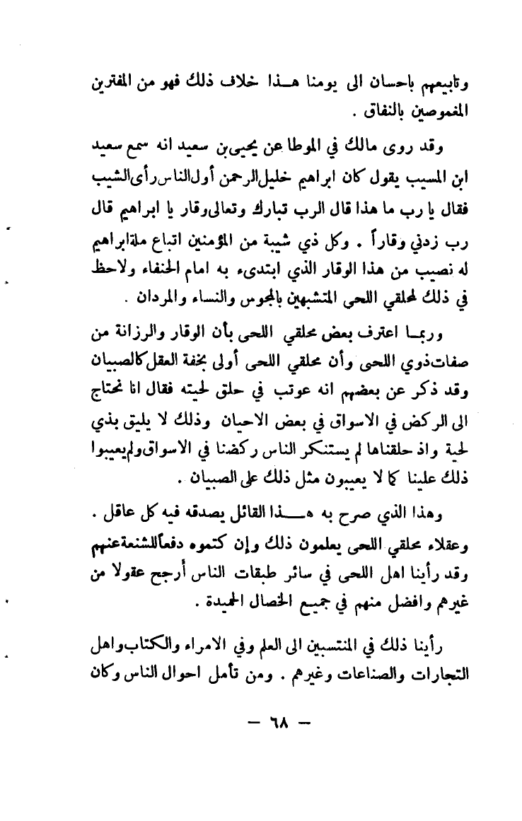 وقد روى مالك في الموطأ عن يحيى بن سعيد أنه سمع سعيد ابن المسيب يقول كان إبراهيم خليل الرحمن أول الناس رأى الشيب فقال يا رب ما هذا قال الرب تبارك وتعالى وقار يا إبراهيم قال رب زدني وقاراً. وكل ذي شيبة من المؤمنين أتباع ملة إبراهيم له نصيب من هذا الوقار الذي ابتدئ به إمام الحنفاء ولاحظ في ذلك لمحلقي اللحى المتشبهين بالمجوس والنساء والمردان.