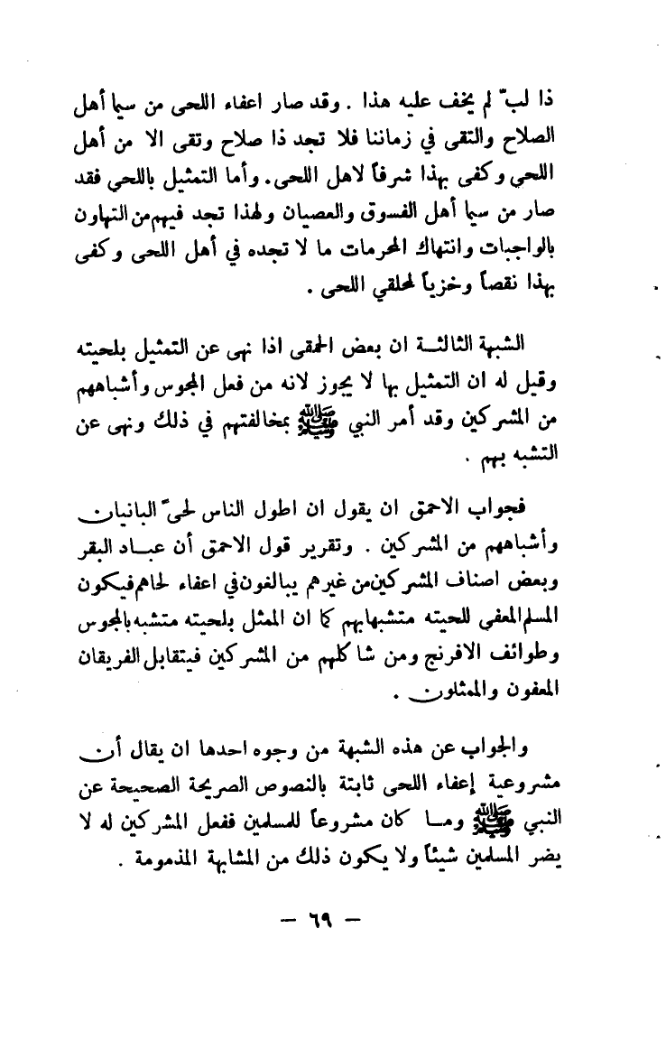 الشبهة الثالثة أن بعض الحمقى إذا نهي عن التمثيل بلحيته وقيل له إن التمثيل بها لا يجوز لأنه من فعل المجوس وأشباههم من المشركين وقد أمر النبي صلى الله عليه وسلم بمخالفتهم في ذلك ونهى عن التشبه بهم.