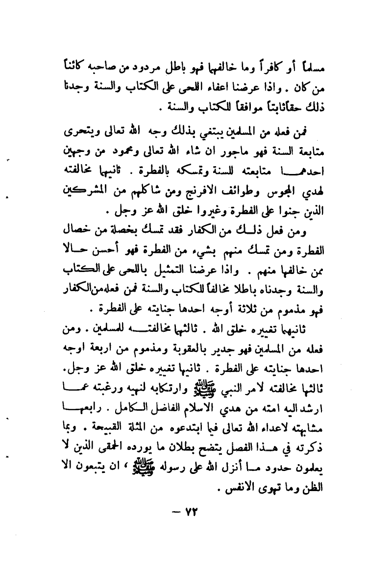ثانيهما تغييره خلق الله. ثالثهما مخالفته للمسلمين. ومن فعله من المسلمين فهو جدير بالعقوبة ومذموم من أربعة أوجه أحدها جنايته على الفطرة. ثانيها تغييره خلق الله عز وجل. ثالثها مخالفته لأمر النبي صلى الله عليه وسلم وارتكابه لنهيه ورغبته عما أرشد إليه أمته من هدي الإسلام الفاضل الكامل. رابعها مشابهته لأعداء الله تعالى فيما ابتدعوه من المثلة القبيحة. وبما ذكرته في هذا الفصل يتضح بطلان ما يورده الحمقى الذين لا يعلمون حدود ما أنزل الله على رسوله صلى الله عليه وسلم، إن يتبعون إلا الظن وما تهوى الأنفس.