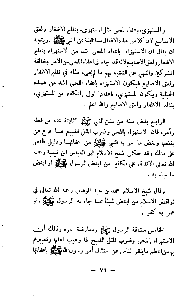 الرابع بغض سنة من سنن النبي صلى الله عليه وسلم الثابتة عنه من فعله وأمره فإن الاستهزاء باللحى وضرب المثل القبيح لها فرع عن بغضها وبغض ما أمر به النبي صلى الله عليه وسلم من إعفائها ودليل ظاهر على ذلك وقد حكى شيخ الإسلام أبو العباس ابن تيمية رحمه الله تعالى الاتفاق على تكفير من أبغض الرسول صلى الله عليه وسلم أو أبغض ما جاء به.