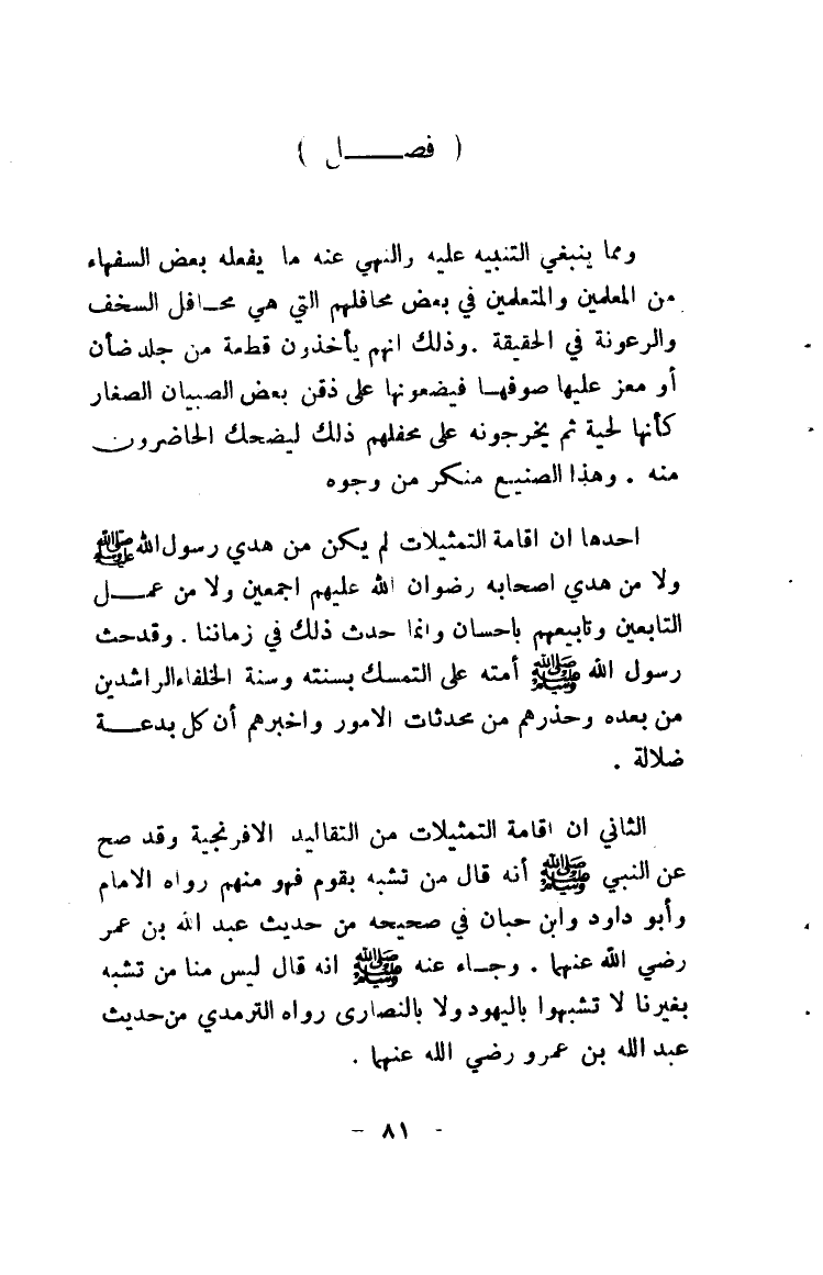 الثاني أن إقامة التمثيلات من التقاليد الإفرنجية وقد صح عن النبي صلى الله عليه وسلم أنه قال من تشبه بقوم فهو منهم رواه الإمام وأبو داود وابن حبان في صحيحه من حديث عبد الله بن عمر رضي الله عنهما. وجاء عنه صلى الله عليه وسلم أنه قال ليس منا من تشبه بغيرنا لا تشبهوا باليهود ولا بالنصارى رواه الترمذي من حديث عبد الله بن عمرو رضي الله عنهما.