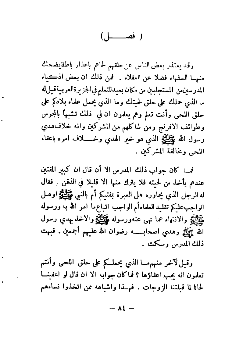 فما كان جواب ذلك المدرس إلا أن قال إن كبير المفتين عندهم يأخذ من لحيته فلا يترك منها إلا قليلاً في الذقن. فقال له الرجل الذي يحاوره هل العبرة بمفتيكم أم بالنبي صلى الله عليه وسلم أو هل الواجب عليكم تقليد العلماء أم الواجب اتباع ما أمر الله به ورسوله صلى الله عليه وسلم والانتهاء عما نهى عنه ورسوله صلى الله عليه وسلم والأخذ بهدي رسول الله صلى الله عليه وسلم وهدي أصحابه رضوان الله عليهم أجمعين. فبهت ذلك المدرس وسكت.