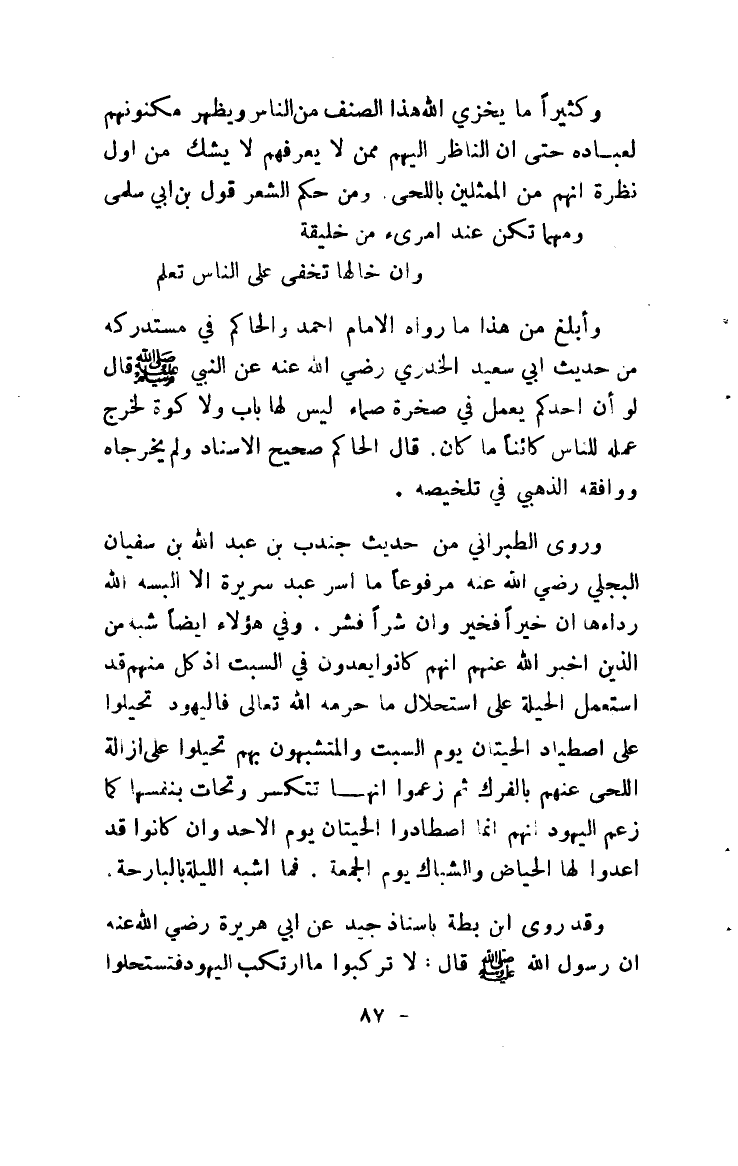 وروى الطبراني من حديث جندب بن عبد الله بن سفيان البجلي رضي الله عنه مرفوعاً ما أسر عبد سريرة إلا ألبسه الله رداءها إن خيراً فخير وإن شراً فشر. وفي هؤلاء أيضاً شبه من الذين أخبر الله عنهم أنهم كانوا يعدون في السبت إذ كل منهم قد استعمل الحيلة على استحلال ما حرمه الله تعالى فاليهود تحيلوا على اصطياد الحيتان يوم السبت والمتشبهون بهم تحيلوا على إزالة اللحى عنهم بالفرك ثم زعموا أنها تتكسر وتحات بنفسها كما زعم اليهود أنهم إنما اصطادوا الحيتان يوم الأحد وإن كانوا قد أعدوا لها الحياض والشباك يوم الجمعة. فما أشبه الليلة بالبارحة.