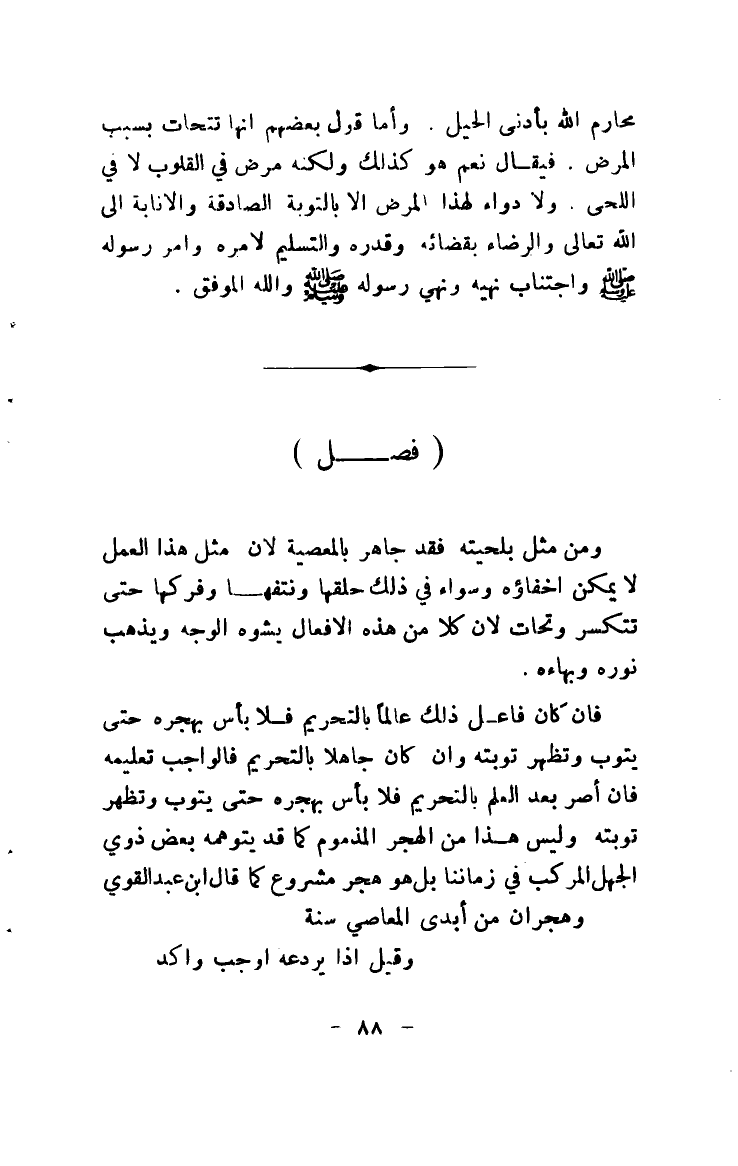 محارم الله بأدنى الحيل. وأما قول بعضهم أنها تتحات بسبب المرض. فيقال نعم هو كذلك ولكنه مرض في القلوب لا في اللحى. ولا دواء لهذا المرض إلا بالتوبة الصادقة والإنابة إلى الله تعالى والرضاء بقضائه وقدره والتسليم لأمره وأمر رسوله صلى الله عليه وسلم واجتناب نهيه ونهي رسوله صلى الله عليه وسلم والله الموفق.