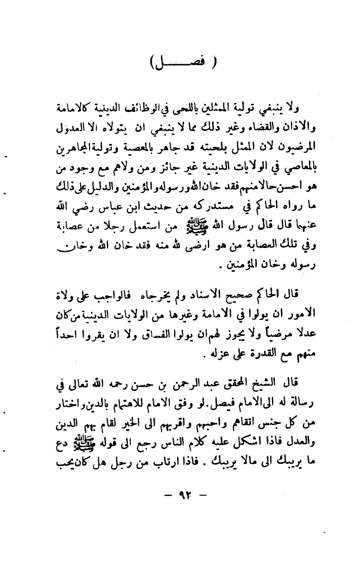 ولا ينبغي تولية الممثلين باللحى في الوظائف الدينية كالإمامة الأذان والقضاء وغير ذلك مما لا ينبغي أن يتولاه إلا العدول المرضيون لأن الممثل بلحيته قد جاهر بالمعصية وتولية المجاهرين بالمعاصي في الولايات الدينية غير جائز ومن ولاهم مع وجود من هو أحسن حالاً منهم فقد خان الله ورسوله والمؤمنين والدليل على ذلك ما رواه الحاكم في مستدركه من حديث ابن عباس رضي الله عنهما قال قال رسول الله صلى الله عليه وسلم من استعمل رجلاً من عصابة وفي تلك العصابة من هو أرضى لله منه فقد خان الله وخان رسوله وخان المؤمنين.