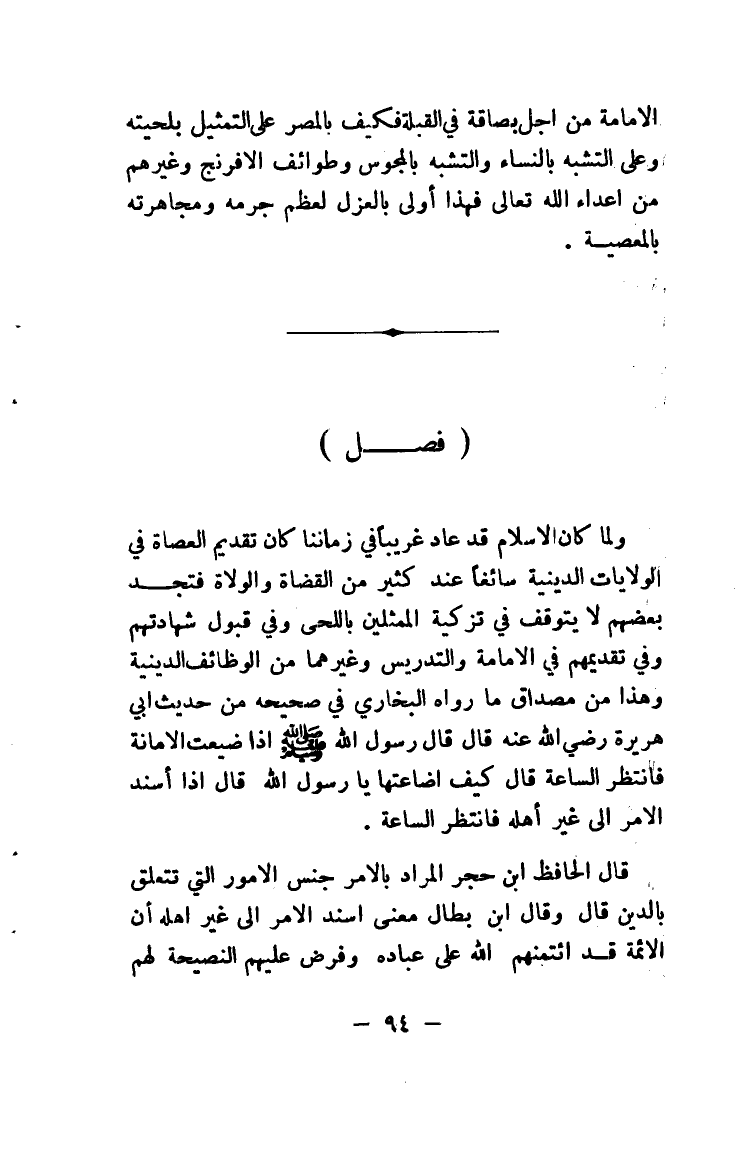 ولما كان الإسلام قد عاد غريباً في زماننا كان تقديم العصاة في الولايات الدينية سائغاً عند كثير من القضاة الولاة فتجد بعضهم لا يتوقف في تزكية الممثلين باللحى وفي قبول شهادتهم وفي تقديمهم في الإمامة والتدريس وغيرهما من الوظائف الدينية وهذا من مصداق ما رواه البخاري في صحيحه من حديث أبي هريرة رضي الله عنه قال قال رسول الله صلى الله عليه وسلم إذا ضيعت الأمانة فانتظر الساعة قال كيف إضاعتها يا رسول الله قال إذا أسند الأمر إلى غير أهله فانتظر الساعة.