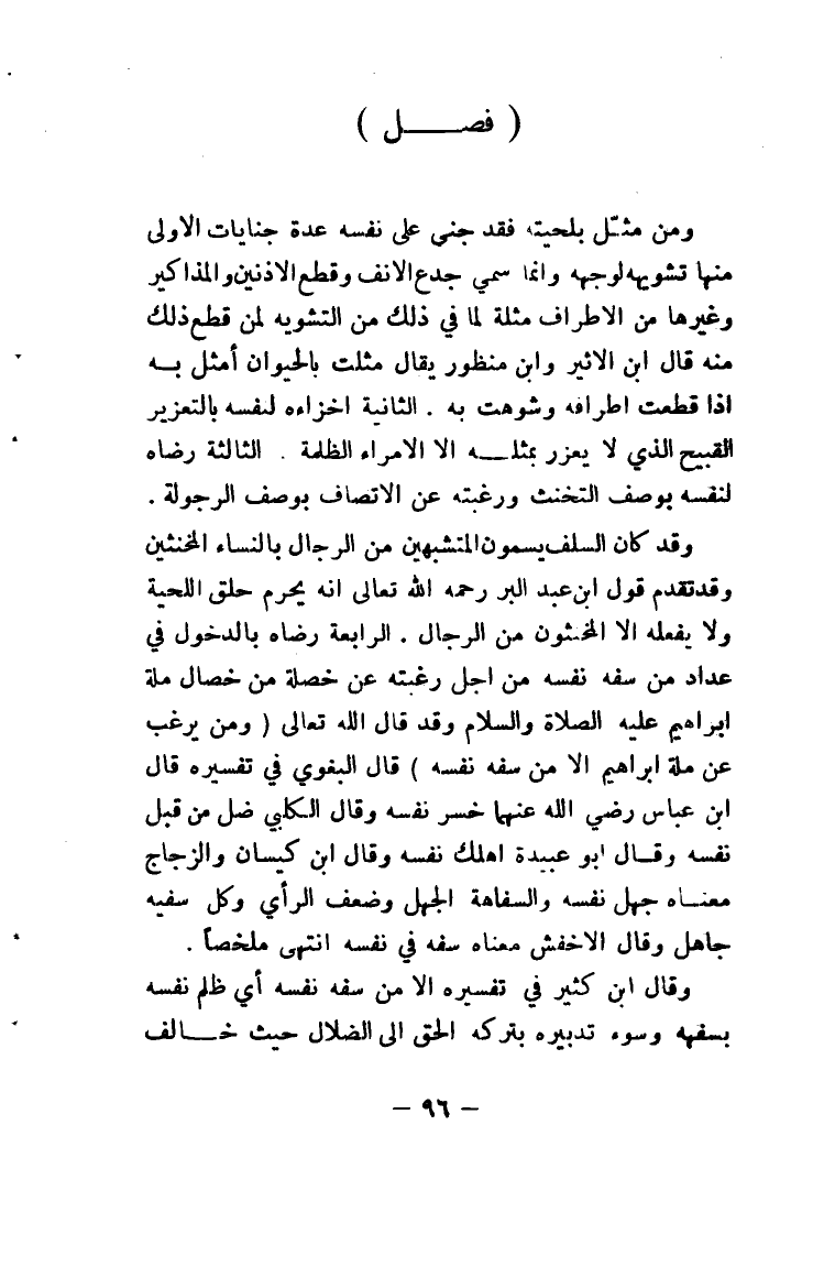 وقد كان السلف يسمون المتشبهين من الرجال بالنساء المخنثين وقد تقدم قول ابن عبد البر رحمه الله تعالى أنه يحرم حلق اللحية ولا يفعله إلا المخنثون من الرجال. الرابعة رضاه بالدخول في عداد من سفه نفسه من أجل رغبته عن خصلة من خصال ملة إبراهيم عليه الصلاة والسلام وقد قال الله تعالى {وَمَنْ يَرْغَبُ عَنْ مِلَّةِ إِبْرَاهِيمَ إِلَّا مَنْ سَفِهَ نَفْسَهُ} [البقرة: 130]، قال البغوي في تفسيره قال ابن عباس رضي الله عنهما خسر نفسه وقال الكلبي ضل من قبل نفسه وقال أبو عبيدة أهلك نفسه وقال ابن كيسان والزجاج معناه جهل نفسه والسفاهة الجهل وضعف الرأي وكل سفيه جاهل وقال الأخفش معناه سفه في نفسه انتهى ملخصاً.