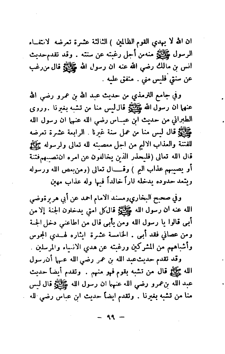 وقد تقدم حديث عبد الله بن عمر رضي الله عنهما أن رسول الله صلى الله عليه وسلم قال «من تشبه بقوم فهو منهم». وتقدم أيضاً حديث عبد الله بن عمرو رضي الله عنهما أن رسول الله صلى الله عليه وسلم قال «ليس منا من تشبه بغيرنا». وتقدم أيضاً حديث ابن عباس رضي الله