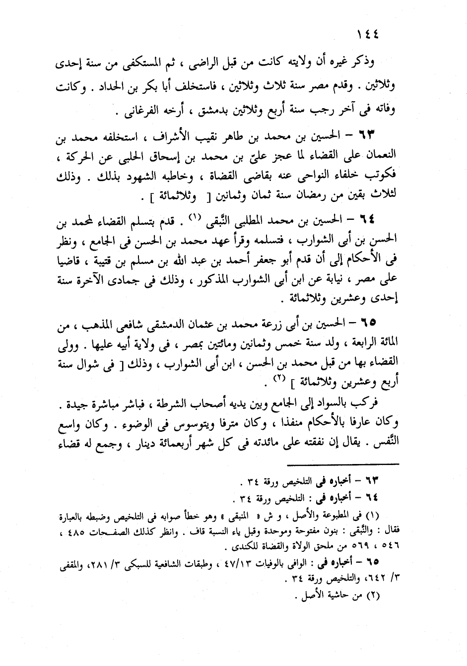 الحسين بن محمد المطلبي النَّبقي. قدم بتسلم القضاء لمحمد بن الحسن بن أبي الشوارب، فتسلمه وقرأ عهد محمد بن الحسن في الجامع، ونظر في الأحكام إلى أن قدم أبو جعفر أحمد بن عبد الله بن مسلم بن قتيبة، قاضياً على مصر، نيابة عن ابن أبي الشوارب المذكور، وذلك في جمادى الآخرة سنة إحدى وعشرين وثلاثمائة.