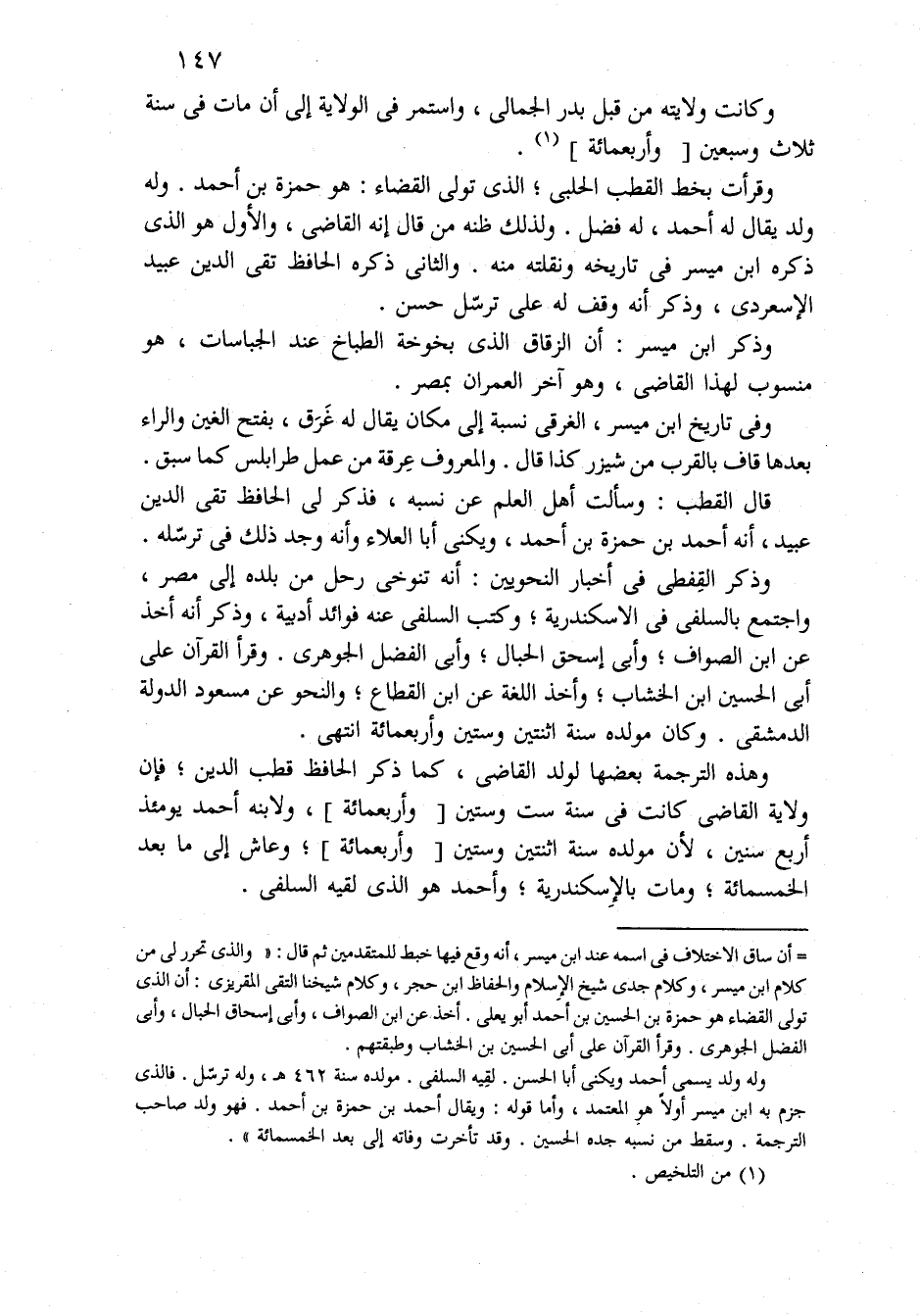 وقرأت بخط القطب الحلبي، الذي تولى القضاء: هو حمزة بن أحمد. وله ولد يقال له أحمد، له فضل. ولذلك ظنه من قال إنه القاضي،