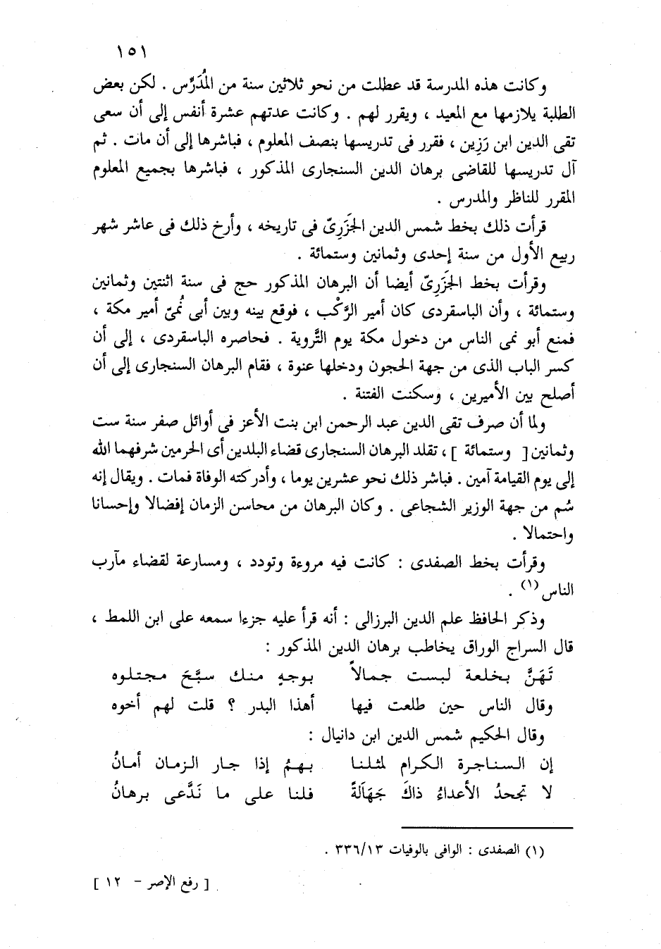 ولما أن صرف تقي الدين عبد الرحمن ابن بنت الأعز في أوائل صفر سنة ست وثمانين وستمائة، تقلد البرهان السنجاري قضاء البلدين أي الحرمين شرفهما الله إلى يوم القيامة آمين. فباشر ذلك نحو عشرين يوماً، وأدركته الوفاة فمات. ويقال أنه شم من جهة الوزير الشجاعي. وكان البرهان من محاسن الزمان إفضالاً وإحساناً واحتمالاً.