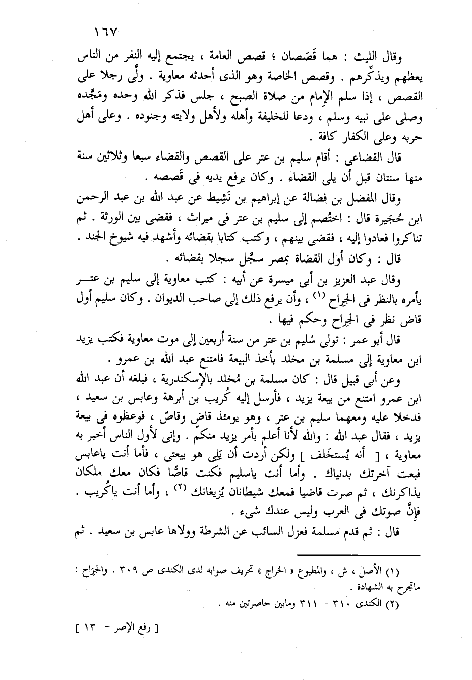 وقال عبد العزيز بن أبي ميسرة عن أبيه: كتب معاوية إلى سليم بن عتر يأمره بالنظر فِي الجِراح، وأن يرفع ذلك إلى صاحب الديوان. وكان سليم أول قاض نظر في الجِراح وحكم فيها.