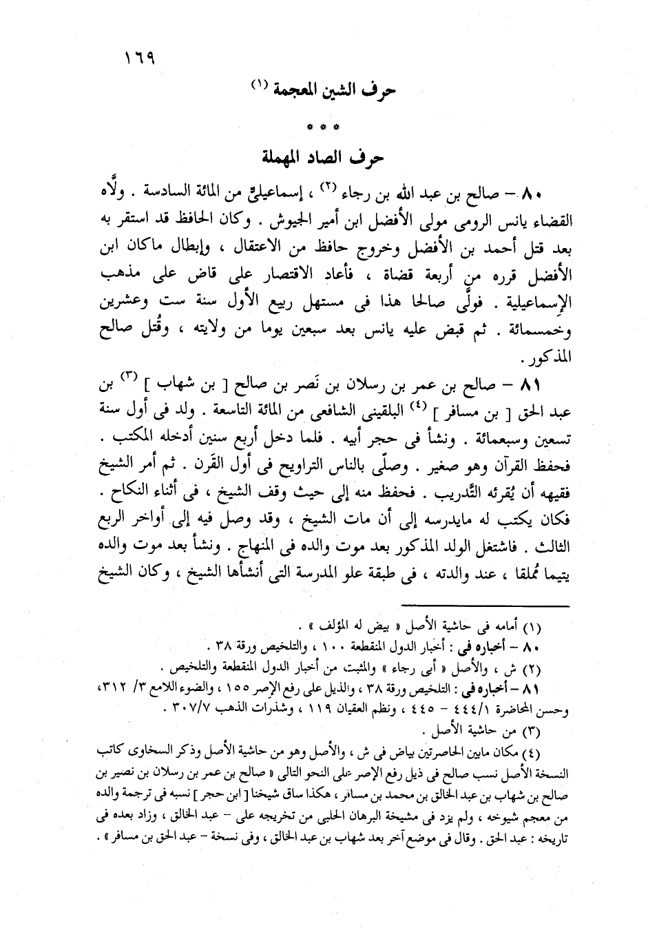 صالح بن عمر بن رسلان بن نَصر بن صالح بن شهاب بن عبد الحق بن مسافر البلقيني الشافعي من المائة التاسعة. ولد في أول سنة تسعين وسبعمائة. نشأ في حجر أبيه. فلما دخل أربع سنين أدخله المكتب. فحفظ القرآن وهو صغير. وصلى بالناس التراويح في أول القَرن. ثم أمر الشيخ فقيه أن يُقبئه التَّدريب. فحفظ منه إلى