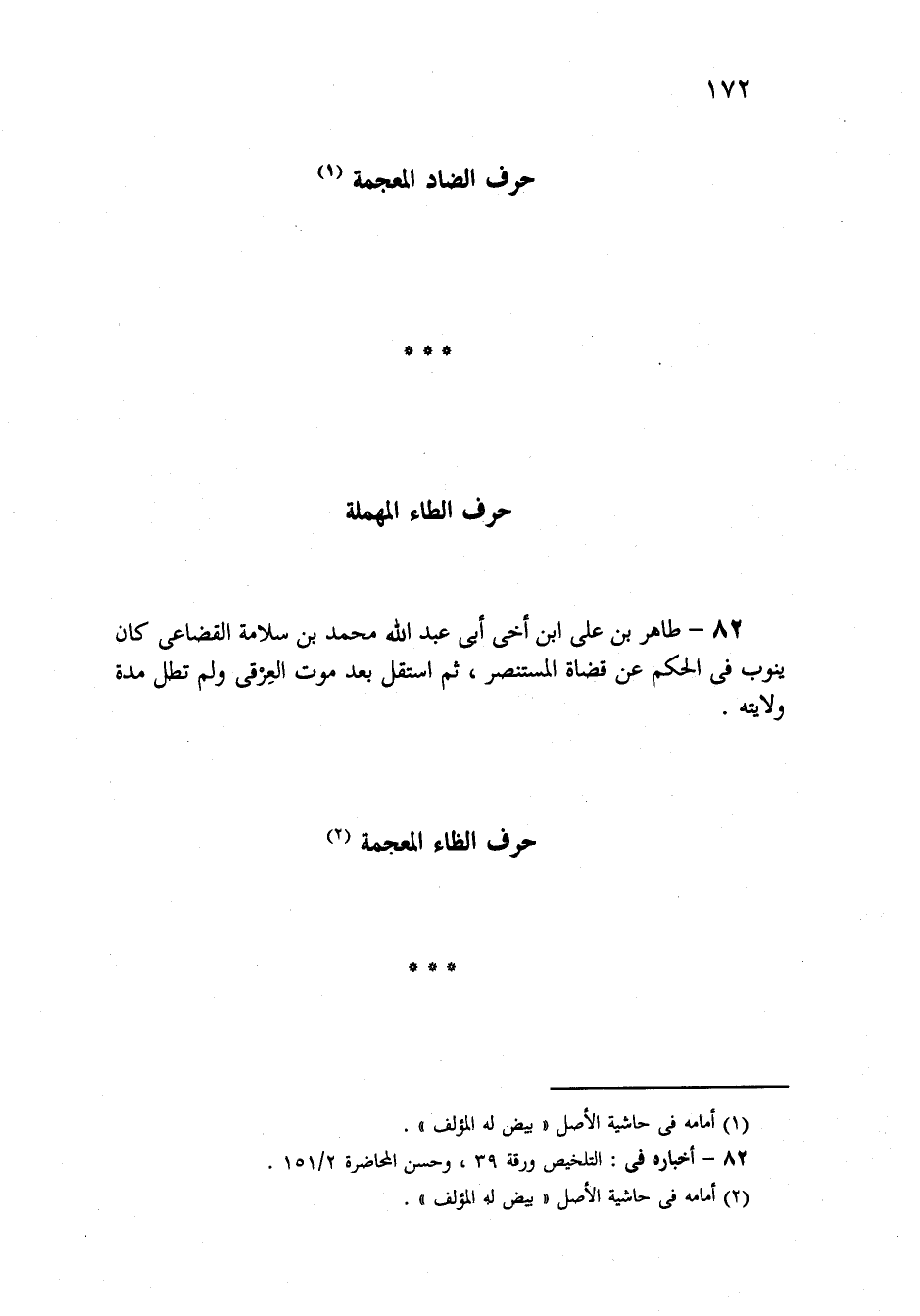طاهر بن علي ابن أخي أبي عبد الله محمد بن سلامة القضاعي كان ينوب في الحكم عن قضاة المستنصر، ثم استقل بعد موت العِرْقي ولم تطل مدة ولايته.