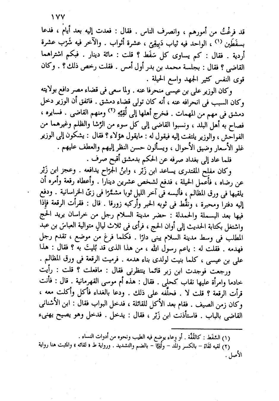 ورجعت فوجدت ابن زبر قائماً ينتظرني فقال: ما فعلت؟ قلت: رأيت خادماً وامرأة عليها نقاب كحلي. فقال: هذه أم موسى القهرمانية. قال: فأنت قرأت الرقعة؟ قلت لا. فحلَّفه على ذلك. ودعا بالغداء فأكل وأكلت معه، وكان زمن الصيف. فقام بعد الأكل للقائلة، فدخل البواب فقال: ابن الأشناني القاضي بالباب. فاستأذنت ابن زَبْر، فقال: يدخل. فدخل وهو يصيح يهنئ